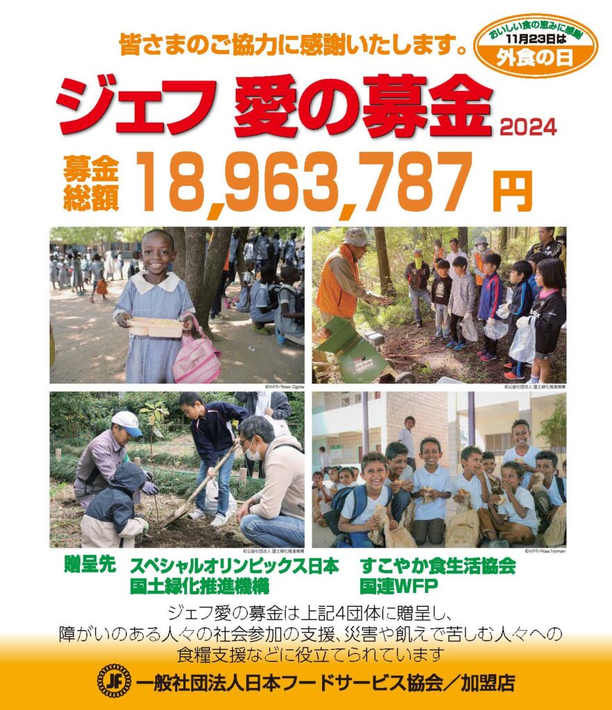 ジェフ愛の募金は1984年より、毎日たくさんのお客様とふれあうことのできる外食産業の特徴を活かした社会貢献活動の一環として、募金活動をスタートしました。